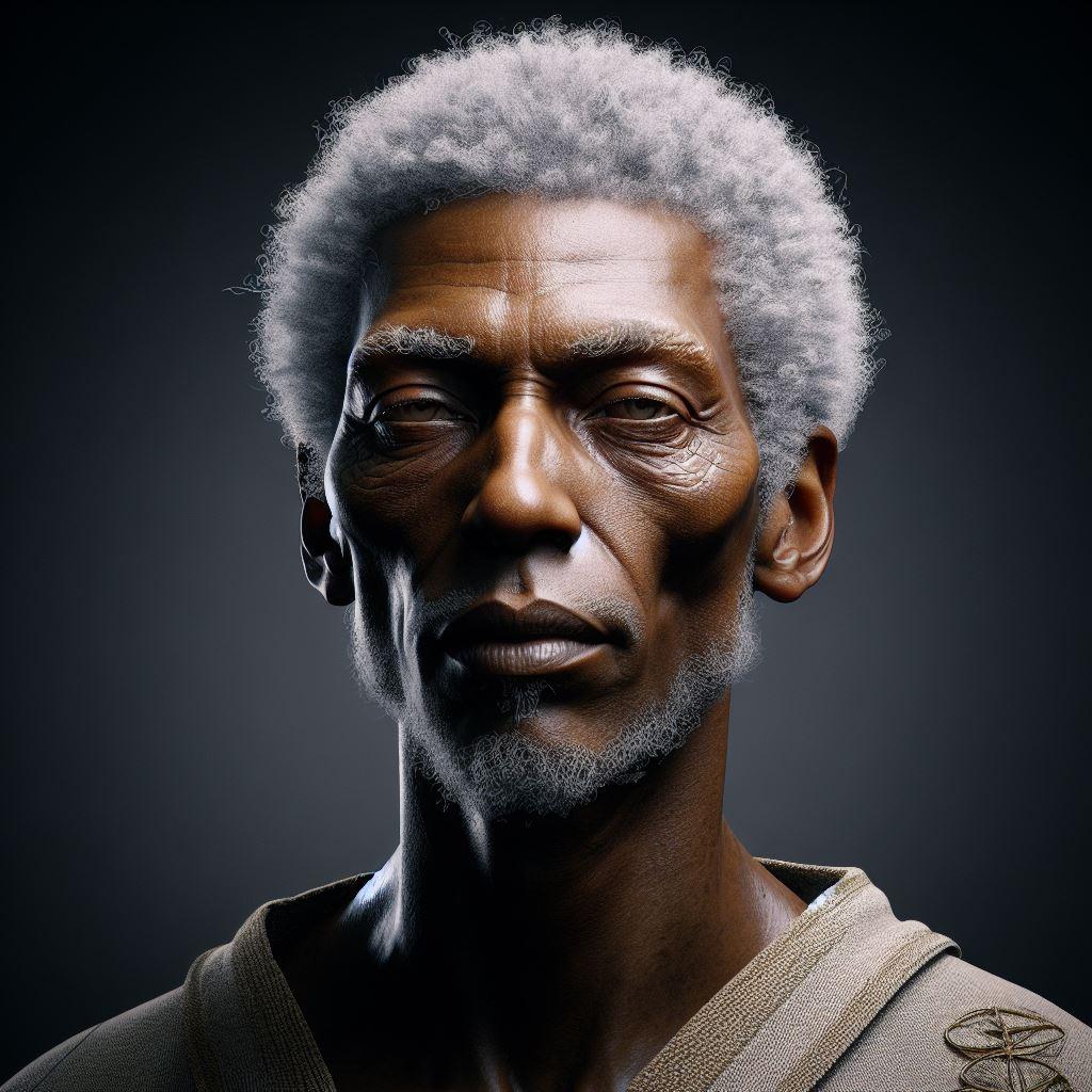 Description: Before you stands a tall, lean figure with sharp, penetrating blue eyes, a voluminous silver afro, and robes that shimmer with an otherworldly hue, hinting at arcane knowledge and power.