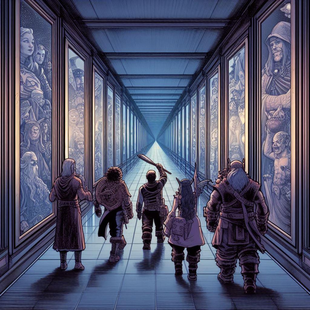 A long corridor, with walls made of mirrors, stands before the adventurers. Each mirror reflects not the present but potential futures, some showing the adventurers healed and triumphant, while others display a harrowing end.