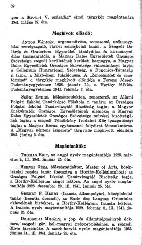 gon a Bjrt.-u.-i V. századig" című tárgykör magántanára 1941. május 27. óta Meghívott előadó: ANTOS KÁLMÁN, orgonaművész, zeneszerző, székesegyháza zeneigazgató, városi zeneiskolai tanár; a Szegedi Dalárda ós Oratórium, Egyesület" királydíjas és kormányzódíjas kariigazgatója, a Magyar Dalos Egyesületek Országos Szövetsége szegedi kerületének kerületi karnagya, a Magyar Dalos Egyesületek Országos Szövetsége választmányi tagja, a Collegium Hungaricum Szövetség, a Dugonics-Társaság i'u tagja, a Mikó-órem tulajdonosa. A „Zeneelmélet és zenetörténet" o. tárgykör meghívott előadója a Ferenc József Tudományegyetemen 1988. január 10., a Horthy MiklósTudományegyetemein 1941. február 8. óta SZÖGI ENDRE, bölcsészetdoktor, zeneszerző, az Állami Polgár) Iskolai Tanárképző Főiskola r. tanára; az Országos Polgári Iskolai Tanárvizsgáló Bizottság tagja; a Magyar Énekoktatók Országos Egyesületének alelnöke; a Magyar Dalos Egyesületek Országos Szövetsége művészi bizottságának tagja; a szegedi Tömörkény Irodalmi Köri igazgatósági tagja; a Magyar Kórus egyházzenei folyóirat főmunkatársa. A „Magyar népzene ismerete" tárgykör! meghívott előadója 1941. június 3. óta.