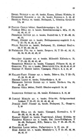 69 E N G E L R U D O L F C. ny. rk. tanár, Kassa, Állami Kórház, 21, E P E R J E S S Y K Á L M Á N e. ny. rk. tanár, Korona-u. 6, 28, 40 E R D É L Y I GYULA m. tan-ár, Budapest, I., Gömbös Gyula-út