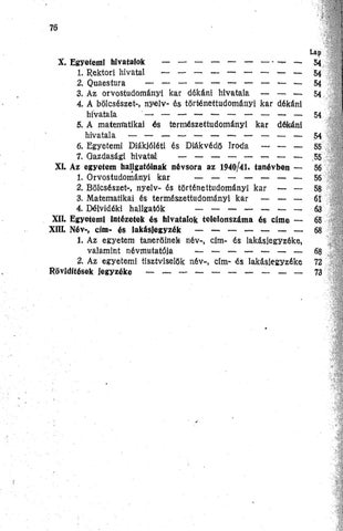 X. Egyetemi hivatalok — 1. Rektori hivatal _ _ _ _ _ _ _ _ _ _ 2. Quaestura _ _ _ _ _ _ _ _ _ _ _ 3. Az orvostudományi kar dékáni hivatala — —. — 4. A bölcsészet-, nyelv- és történettudományi kar dékáni hivatala — 5. A matematikai és természettudományi kar dékáni hivatala — — — — — — — — — — — 6. Egyetemi Diákjóléti és Diákvédő Iroda — — — 7. Gazdasági hivatal _ _ _ _ _ _ _ _ XI. Az egyetem hallgatóinak névsora az 1940/41. tanévben — 1. Orvostudományi kar _ _ _ _ _ _ _ 2. Bölcsészet-, nyelv- és történettudományi kar — — 3. Matematikai és természettudományi kar — —- — 4. Délvidéki hallgatók _ _ _ _ _ _ _ _ XII. Egyetemi intézetek és hivatalok telefonszáma és elme — XIII. Név-, cím- és lakásjegyzék _ _ _ _ _ _ _ 1. Az egyetem tanerőinek név-, cím- és lakásiegyzéke, valamint névmutatója _ _ _ _ _ _ _ 2. Az egyetemi tisztviselők név-, cím- és lakásiegyzéke Rövidítések Jegyzéke _ _ - _ - _ _ _ _ _