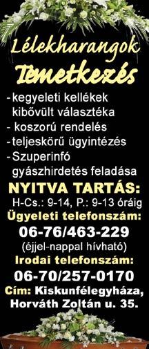 2022. szeptember 5-én elhunyt. Drága szerettünk temetése 2022. szeptember 19-én 10 órakor lesz a kiskunfélegyházi Alsótemetőben. Lelki üdvéért az engesztelő szentmisét 2022. szeptember 19-én 7:30 órakor a Sarlós Boldogasszony templomban mutattatjuk be. Soha el nem múló szeretetünk őrködik nyugalmad felett. - Gyászoló család -