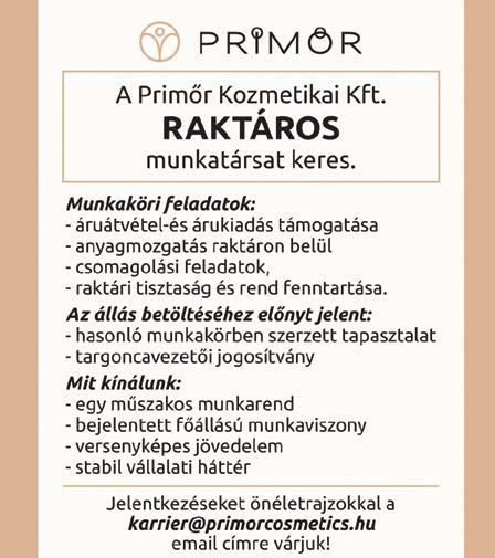 RAKTÁROS állásra munkatársat keresünk napi 8 órában a Molnártelepre. Tel.: 06-70/634-3312 -Kátai KristófVárosföldi Sárga Kocsi Vendéglőbe PULTOS hölgyet keresünk, azonnali kezdéssel. Tel.: 06-20/203-3058