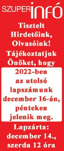 KISKUNFÉLEGYHÁZA VÁROS ÉS KÖRZETE SZUPERINFÓ Megjelenik Kiskunfélegyházán és a környező településeken minden pénteken 20.000 példányban. Lapzárta: kedd 17 óra ; Felelős kiadó: Bozsó István Szerkesztőség: Kkfháza, Dr. Holló Lajos u. 2. Nyitvatartás: hétfőtől - péntekig: 8-17 óráig Telefon/fax: 76/430-455 Mobil elérhetőség: 06-30/429-7812 Internet: http://www.szuperinfo.hu E-mail: kkfhaza@szuperinfo.hu A megjelent hirdetések tartalmáért felelősséget
