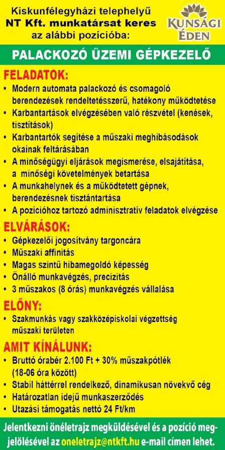 KERTÉSZETBE (paradicsomos) női munkaerőt keresek egész évi folyamatos munkára. Tel.: 06-30/943-2439 (18 óra után) -Ladányi kertészetRendezvényeszközök telepítésére keresünk nem dohányzó csapatunkba, kiskunfélegyházi férfi munkatársat. Hosszabb távra is tervezhető munka vagy felnőtt diákoknak is jó nyári munkalehetőség. Érdeklődni személyesen, időpont egyeztetés telefonon: 06-30/9434012 (Gyürky L.)