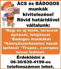 Ácsmunka, tetőjavítás, tetőfedés, bádogosmunk a, cserepeslemezelés, ereszcsatornázás, széldeszkázás, tetőáthajtás, kúpkikenés, egyéb javítások országosan ingyenes kiszállással. Kedvezmény 15 % 2023 április 30-ig. Tel.: 06-30/928-9443
