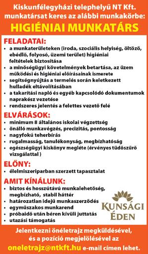 A Szivárvány Személyes Gondoskodást Nyújtó Intézmény állást hirdet a Csanyi út 4. szám alatti konyhájára KONYHAI KISEGÍTŐ munkakör betöltésére. Érdeklődni Zeleiné Tamási Klára élelmezésvezetőnél lehet a 06-30/815-5405-ös telefonszámon. Részletes pályázati kiírás a kiskunfelegyhaza.hu oldalon olvasható.