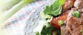 4. A sült tarját tálaljuk a salátával és a sült retekcikkekkel, díszítsük felcsíkozott újhagymazölddel.