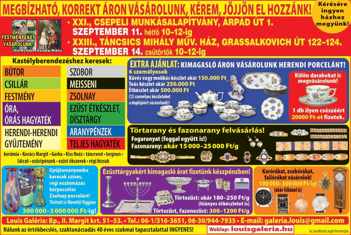 Exkluzív üzletünk: Louis Galéria • II., Margit krt. 51–53. Tel.: 316-3651, 06-30/944-7935 • E-mail: galeria.louis@gmail.com (A 4-es, 6-os villamosról a Mechwart liget megállónál kell leszállni) A LOUIS GALÉRIÁBAN AZ ÉRTÉKBECSLÉS INGYENES!