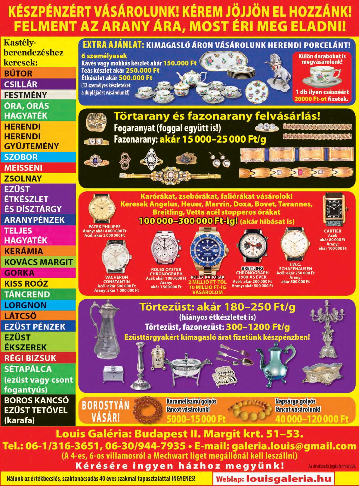 Exkluzív üzletünk: Louis Galéria • II., Margit krt. 51–53. Tel.: 316-3651, 06-30/944-7935 • E-mail: galeria.louis@gmail.com (A 4-es, 6-os villamosról a Mechwart liget megállónál kell leszállni) A LOUIS GALÉRIÁBAN AZ ÉRTÉKBECSLÉS INGYENES!