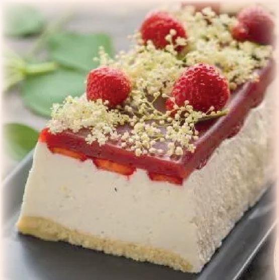4. Pár órára a hűtőszekrénybe tesszük, hogy megdermedjen. Ha már megszilárdult, akkor a babapiskótákat megmártjuk a bodzaszörppel megmelegített tejben, és szép sorban rárakjuk a krém tetejére. Hűtjük még pár órát, hogy biztosan megszilárduljon a közepe is. Tálalás előtt óvatosan átfordítjuk egy tálra. A tetejét friss eperrel és bodzavirággal díszítjük.