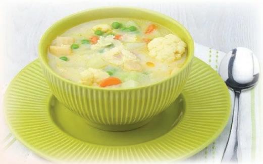1. A sárga- és fehérrépát megtisztítjuk, és felkarikázzuk. A meghámozott karalábét felkockázzuk. A karfiolt megtisztítjuk és rózsáira bontjuk. A borsót kissé felengedjük.
