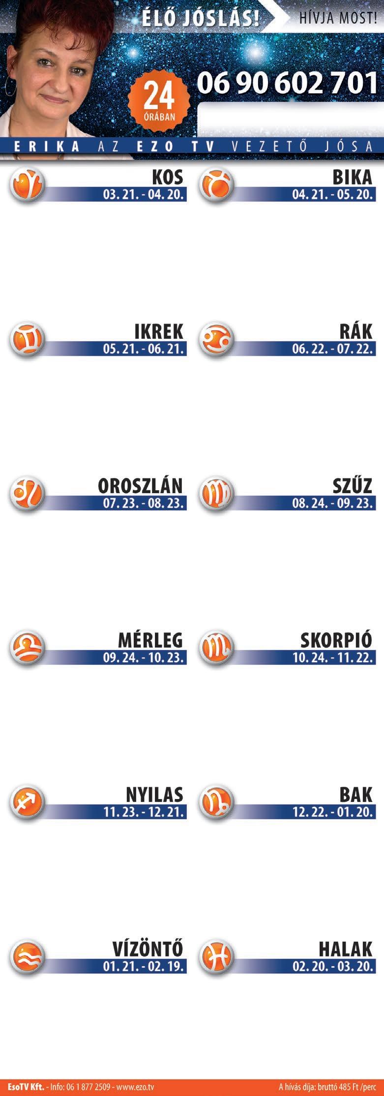 Itt az ideje, hogy a figyelmét önmagára irányítsa. Túl sokat foglalkozik mások életével. A héten lehetősége adódik izgalmas társadalmi eseményeken részt venni, a kapcsolatait ápolni, úgy, hogy nem akar közben görcsösen mások segítségére sietni.