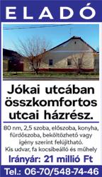 Eladó 36 m2-es HÁZRÉSZ a városközpont közelében, közel a főutakhoz, de mégis csendes utcában, melléképületekkel. Víz, villany, gáz külön mérőórával. A ház csatornázott. Tel.: 06-30/459-0989