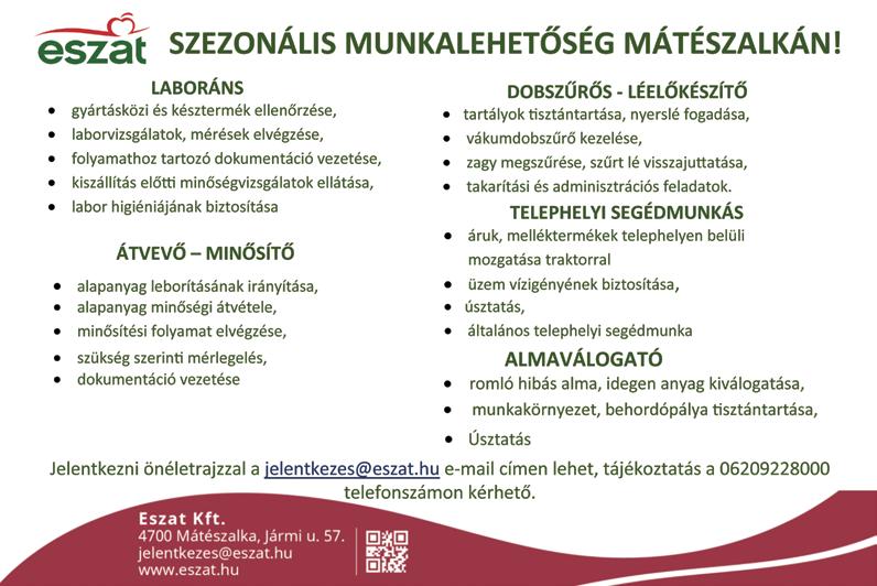 Hasonló területen szerzett tapasztalat előny, de nem feltétel. Érdeklődni a 0670/632-2178 telefonszámon lehet.