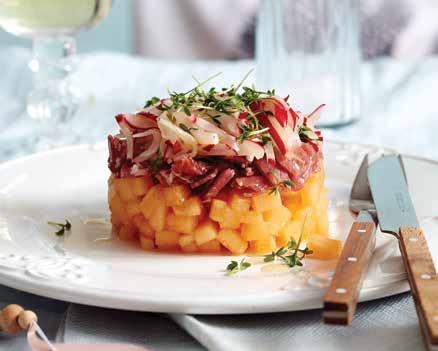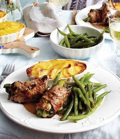 3. A megtisztított újhagymát vágjuk fel 4 cm-es darabokra. A megmosott, szárazra törölt hússzeleteket kissé klopfoljuk ki. Sózzuk, borsozzuk meg őket, és osszuk el rajtuk az újhagymát, valamint az elmorzsolt sajtot. Tekerjük fel a húsokat, és tűzzük meg őket 1-1 db fogpiszkálóval.