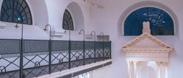 illetve lépcsőn át megközelíthető rendezvényteret mélyítettünk le, így biztosítva az épület eredeti megjelenését és szimmetriáját. Ezáltal a nagyterem alatti beépítés földszintté változott a mindkét irányba közvetlen megközelítési és menekülési lehetőséget, valamint természetes bevilágítást és szellőzést biztosító üvegezett kétszárnyú ajtók sorával, melyek kiosztása a nagyterem meglévő homlokzati félkör pillérjeinek a kiosztásához igazodik. Az étteremnek északon és délen is közvetlenül a szabadba nyíló kétszárnyú, üvegezett bejáratai vannak, így az tulajdonképpen egy földszintnek minősülő szinten helyezkedik el. Az új étteremnek ezen a két oldalán egy-egy rendezvénytér lesz