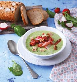4.A tálaláshoz a retket tisztítsuk meg, és karikázzuk fel. Egy kis serpenyőben hevítsük fel az olajat, majd pirítsuk meg benne a felcsíkozott sonkát. A kenyeret pirítsuk meg, és kockázzuk fel. Tálaljuk a levest a sonkacsíkokkal, a kenyérkockákkal és a felkarikázott retekkel.