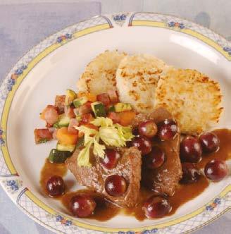 5.A raguhoz az olajon megfuttatjuk a sonkát, majd rátesszük a hagymát, a cukkinit, és összepirítjuk. A főtt répát kockákra vágjuk, a raguhoz keverjük, sózzuk, borsozzuk, összeforgatjuk. Tálaláskor tányérra tesszük a ragut meg a húst, amit alaposan meglocsolunk a szőlős mártással. Párolt rizzsel körítjük.