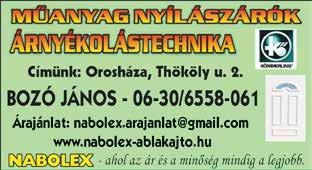 Kerti kiülők, wc-k, hintaágyak készletből azonnal megvásárolhatók. Szállításban segítek. 70/424-7820, 70/632-5836. Ablak, erkélyajtó, üvegfalak kitűnő minőségben, bontásból, Németországból. Beépítését is vállaljuk. 30/282-9225. 2 vagy 3 tagú zenekart keresek, vagy külön keresek szintetizátorost. 20/3676889.