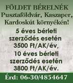 Földet bérelnék Pusztaföldvár, Kaszaper, Kardoskút környékén! 5 éves bérleti szerződés esetén 3500 Ft/AK/év, 10 éves bérleti szerződés esetén 3800 Ft/AK/ év. 06/30/485-4647