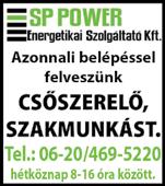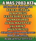 Villanyszerelőket keres B kategóriás jogosítvánnyal és szerelési tapasztalattal szentesi telephelyű cég. Agrotech-Komfort Kft. Érd.: 30/219-2823, info@agrotk.hu Kőműves-, ács-, festési munkákat vállalunk. Filipovics: 70/7258431 Állattartó telepre munkatársat keresünk szolgálati lakás biztosításával Csongrád megyében. Érd. 30/967-7700 (Ménesbirtok Kft.) Csanytelekre kereskedelembe és kertészetbe, ház körüli munkára szakképzett és szakképzetlen női és férfi munkaerőt veszünk fel. Szállást biztosítunk. 20/4670993. (Margaréta ev.)