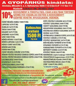 5 2023. január 27. ALMAVÁSÁR Szentesen, az Alma Kft. fábiáni út melletti telephelyén folytatódik az ALMAVÁSÁR Nyitva: hétfõtõl-péntekig 7-15 óráig. Érd.: 30/855-9693, 30/643-4985, 30/436-0454. Légkamrás, fehér KÖNYÖKLŐK raktárról, 10–60 cm mélységig. 0668 633-998 www.zablakajto.hu 0630 787-2855 oroshaza@zablakajto.hu Orosháza, Kossuth Lajos u. 6–8. Önállóan szeretné ablakait beépíteni? Mindent tudunk adni hozzá raktárról! • FAÉK • PURHAB • CSAVAR • SZEGŐK • FÚRÓSZÁRAK STB. EZMEGÉRI! EUTR: AB3760715 06-30/166-2603 Eladó kalodás tűzifa! 32.000 Ft/m3 1x1x1 m, sorba rakva bükk, tölgy, akác. Tavalyi kiTErmElés! TŰZIFA: TÖLGY (HASÍTOTT). SÓDER KAPHATÓ KISZÁLLÍTÁSSAL IS. EUTR a.sz.: AA1445341. Mihalics Tüzép 06-30/249-5908. Kútfúrás Tótkomlós és