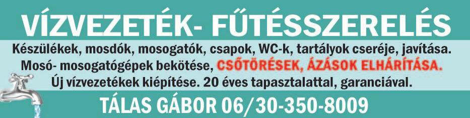 VÍZVEZETÉK- FŰTÉSSZERELÉS. Készülékek, mosdók, mosogatók, csapok, WC-ék, tartályok cseréje, javítása. Mosó- mosogatógépek bekötése, CSŐTÖRÉSEK, ÁZÁSOK ELHÁRÍTÁSA. Új vízvezetékek kiépítése. 20 éves tapasztalattal, garanciával. TÁLAS GÁBOR 06/30350-8009
