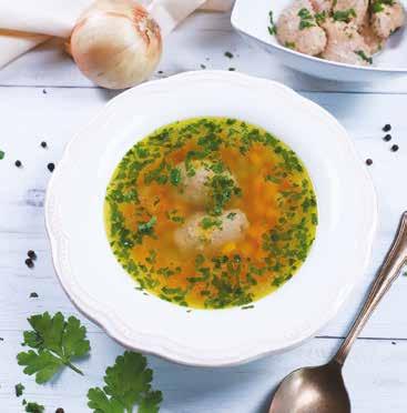 ½ fej vöröshagyma, 3 ek olaj, 150 g kenőmájas, 2 csokor petrezselyem, 2 ek zsem lemorzsa, 1 db tojás, só, frissen őrölt bors, 2 db sárgarépa, 1 db fehérrépa, 1 ág szárzeller, 3 l húsleves-alaplé (kockából).