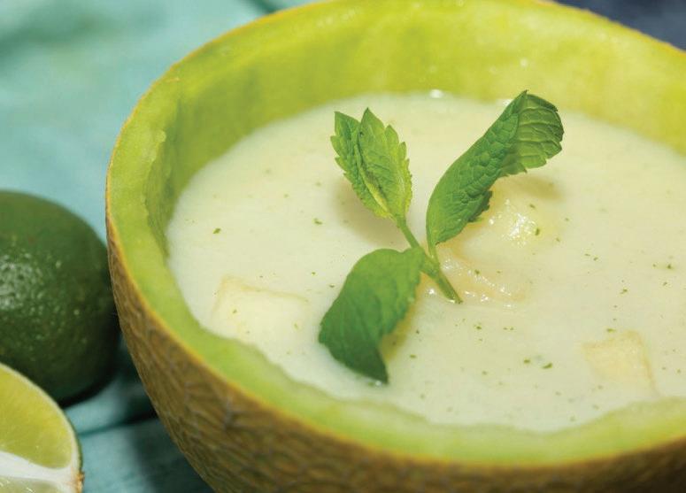 1 db sárgadinnye, 3 ek barna cukor vagy kristálycukor, 1 csom vaníliás cukor, 3 dl kókusztej, 2 ek görög joghurt, 1 db lime, 8 db mentalevél.