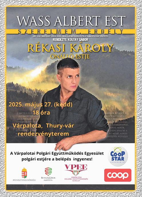 Szerelmem, Erdély – Wass Albert-est Rékasi Károly színművésszel május 27-én, kedden 18 órától a Thury-vár rendezvénytermében a Várpalotai Polgári Együttműködés Egyesület szervezésében. A belépés ingyenes