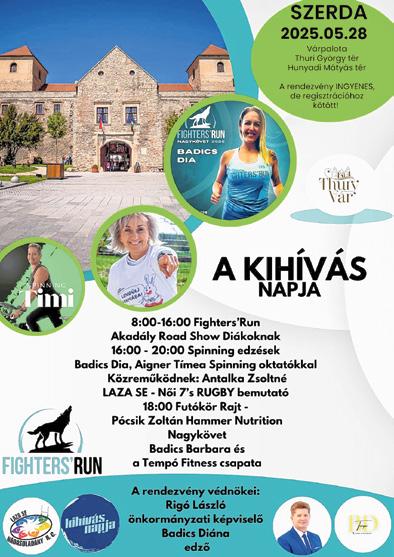A kihívás napja Várpalotán május 28-án, szerdán a Thury-várnál. 8.0016.00 Fighter’s Run akadály roadshow diákoknak 16.00-20.00 Spinning edzések Badics Dia és Aigner Tímea oktatókkal, LAZA SE női 7’s rugby bemutató 18.00 Futókör rajt