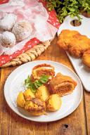 3 A karajt mossuk meg, szeleteljük fel, sózzuk meg, a szeleteken osszuk el a darált húsos keveréket. Tekerjük fel, majd hempergessük meg a tekercseket a lisztben, a felvert tojásban és a zsemlemorzsában. Végül süssük aranyszínűre 250-300 ml felforrósított olajban. Szedjük ki papírtörlőre, majd tálaljuk a ropogósra sült krumplival. Friss tejföllel vagy savanyúsággal kínálhatjuk. Elkészítési idő: 90-150 perc