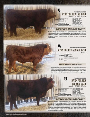 BW 86 lbs WW 744 lbs YW 1012 lbs Jan 14/17: 1205 lbs CE 12.7 BW 0.8 WW 58 YW 78 MWWT 53 MILK 24 Are you in search of a new heifer bull? Take a good look at MVRN Pol Red Boomer 294 D. He has 2 generations of heifer bull breeding back to back, and the last 4 generations of females here calved easily and weighed in between 76 and 92 lbs. He also has a maternal great grand dam that has produced long bodied calving ease cattle on a variety of sires. Please note that his yearling weight was taken the first of December at an age of approximately 10 months.