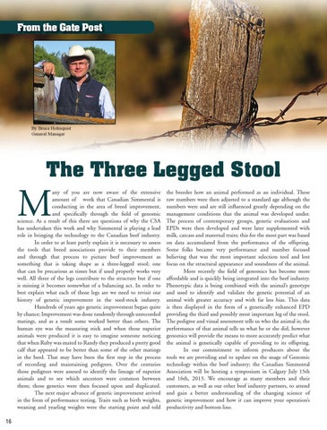 any of you are now aware of the extensive amount of work that Canadian Simmental is conducting in the area of breed improvement, and specifically through the field of genomic science. As a result of this there are questions of why the CSA has undertaken this work and why Simmental is playing a lead role in bringing the technology to the Canadian beef industry. In order to at least partly explain it is necessary to assess the tools that breed associations provide to their members and through that process to picture beef improvement as something that is taking shape as a three-legged stool; one that can be precarious at times but if used properly works very well. All three of the legs contribute to the structure but if one is missing it becomes somewhat of a balancing act. In order to best explain what each of those legs are we need to revisit our history of genetic improvement in the seed-stock industry. Hundreds of years ago genetic improvement began quite by chance; Improvement was done randomly through unrecorded matings, and as a result some worked better than others. The human eye was the measuring stick and when those superior animals were produced it is easy to imagine someone noticing that when Ruby was mated to Randy they produced a pretty good calf that appeared to be better than some of the other matings in the herd. That may have been the first step in the process of recording and maintaining pedigrees. Over the centuries those pedigrees were assesed to identify the lineage of superior animals and to see which ancestors were common between them; those genetics were then focused upon and duplicated. The next major advance of genetic improvement arrived in the form of performance testing. Traits such as birth weights, weaning and yearling weights were the starting point and told 16