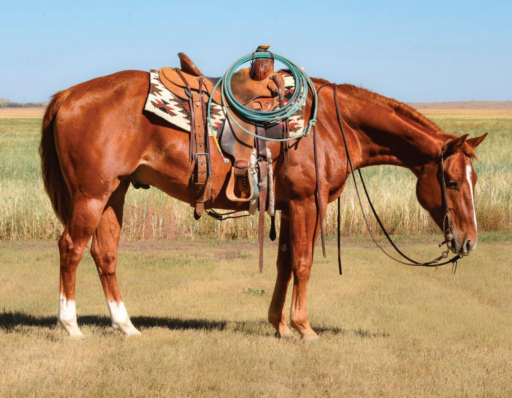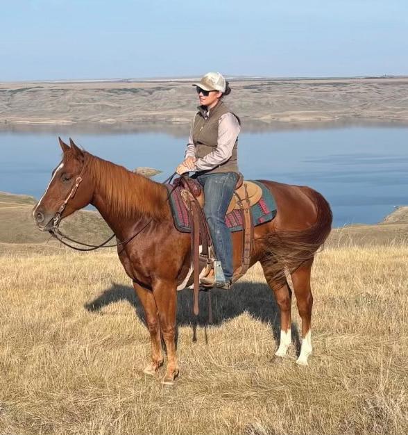 A topnotch work ethic wrapped up in Cadillac style, this is the gelding you can’t wait to take to town, and are excited to be mounted on for a long day. Gunner is a smooth traveling, big hearted guy with personality plus, he was professionally started and spent 6 months total with John and Jamie Tilley of Tilley’s Custom Colts, and has since been used on the community pasture and feedlot by Zoe & Brandon Maxwell. He has been used to start a handful of colts, a steady friend for them to lean on and a helping hand for his rider when they need their mount to read and react to the job needing done. While he is forward on cattle, Gunner has proven to be strong and capable when dallied off on, and has a good foundation of rope work. Soft in the face and sides, he rides around broke at the wither and soft in the ribcage just waiting for you to say woah. Sidepass, counter arcs, spins, he neck reins and rides off your leg the way you want one to. Great to catch, tie, handle, good with his feet (trims and shoes), he’s quiet in the barn and loads and hauls easily. What he’s missing in chrome or roan, Gunner makes up for in usability, heart, and that beautiful shine you can only get on a deep sorrel.
