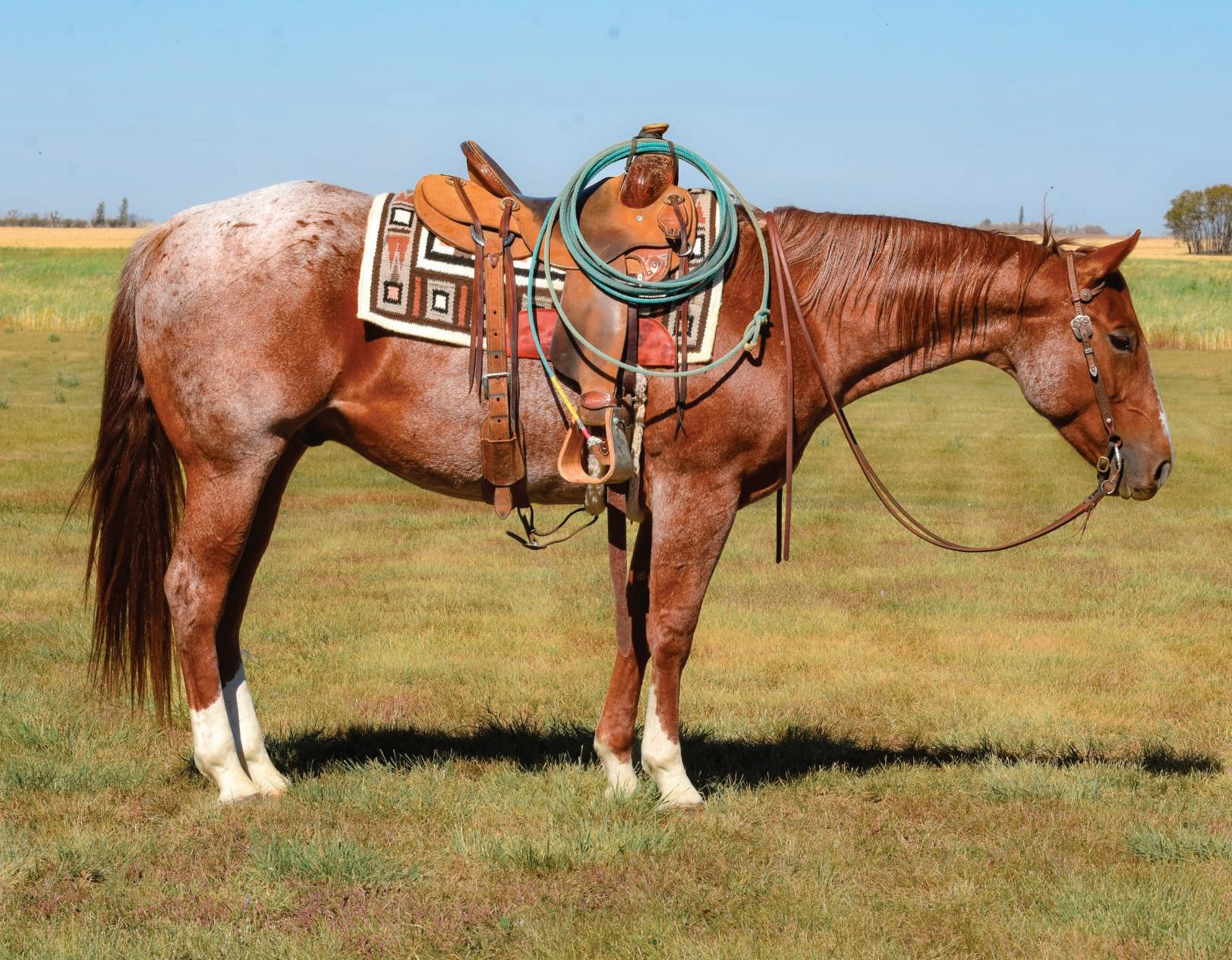 The Peptos Boon Shine sons need very little introduction, if you’ve been around one then you already know what kind of gelding Walker is. Kind hearted, sensitive, extremely intelligent, this is the gelding you want under you to cover your big circle. He’s got no quit in the best kind of way, if there’s more work to be done Walker is right there with you. He was professionally started by and spent 6 months with John and Jamie Tilley of Tilley’s Custom Colts, and has since lived the community pasture experience with Zoe & Brandon Maxwell, being used for everything from take in to take out. This is the gelding you catch at 5am before the sun comes up, bail on fresh out of the trailer, and hit a long trot over the hills to gather pairs. If you don’t make it back to the trailer before supper, you won’t be hearing any complaints out of Walker. He is alert and attentive on cattle, confident enough to use his body to push and block when asked but sensitive enough to keep himself in the right spot. Extremely light sided, Walker has a lovely two track, sidepass, counter arc, handy turn around, solid stop, and soft back up. He is forward moving and likes to travel, and is ready to be taken to the next step in the roping pen. Walker is good to trim and shoe, gentle in a herd, loads and hauls quietly, and is easy to handle.