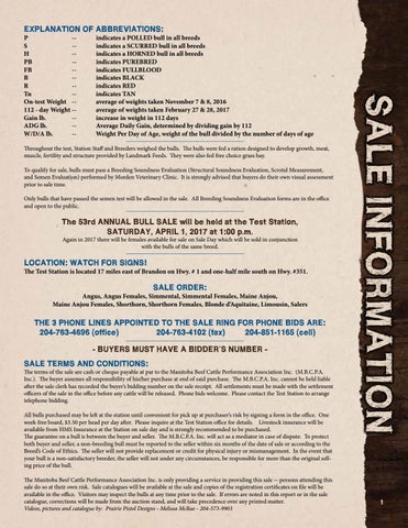 THE 3 PHONE LINES APPOINTED TO THE SALE RING FOR PHONE BIDS ARE: 204-763-4696 (office) 204-763-4102 (fax) 204-851-1165 (cell) - BUYERS MUST HAVE A BIDDER’S NUMBER SALE TERMS AND CONDITIONS: The terms of the sale are cash or cheque payable at par to the Manitoba Beef Cattle Performance Association Inc. (M.B.C.P.A. Inc.). The buyer assumes all responsibility of his/her purchase at end of said purchase. The M.B.C.P.A. Inc. cannot be held liable after the sale clerk has recorded the buyer’s bidding number on the sale receipt. All settlements must be made with the settlement officers of the sale in the office before any cattle will be released. Phone bids welcome. Please contact the Test Station to arrange telephone bidding. All bulls purchased may be left at the station until convenient for pick up at purchaser’s risk by signing a form in the office. One week free board, $3.50 per head per day after. Please inquire at the Test Station office for details. Livestock insurance will be available from HMS Insurance at the Station on sale day and is strongly recommended to be purchased. The guarantee on a bull is between the buyer and seller. The M.B.C.P.A. Inc. will act as a mediator in case of dispute. To protect both buyer and seller, a non-breeding bull must be reported to the seller within six months of the date of sale or according to the Breed’s Code of Ethics. The seller will not provide replacement or credit for physical injury or mismanagement. In the event that your bull is a non-satisfactory breeder, the seller will not under any circumstances, be responsible for more than the original selling price of the bull. The Manitoba Beef Cattle Performance Association Inc. is only providing a service in providing this sale -- persons attending this sale do so at their own risk. Sale catalogues will be available at the sale and copies of the registration certificates on file will be available in the office. Visitors may inspect the bulls at any time prior to the sale. If errors are noted in this report or in the sale catalogue, corrections will be made from the auction stand, and will take precedence over any printed matter. Videos, pictures and catalogue by: Prairie Pistol Designs - Melissa McRae - 204-573-9903