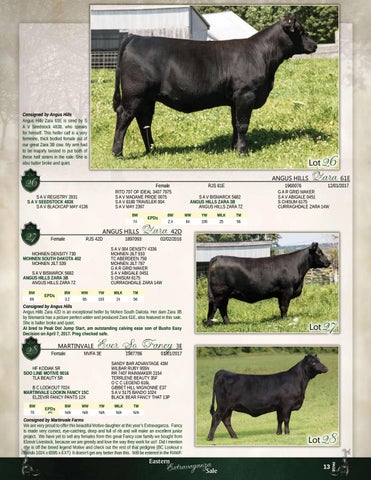 Consigned by Angus Hills Angus Hills Zara 42D is an exceptional heifer by Mohen South Dakota. Her dam Zara 3B by Bismarck has a picture perfect udder and produced Zara 61E, also featured in this sale. She is halter broke and quiet. AI bred to Peak Dot Jump Start, am outstanding calving ease son of Bushs Easy Decision on April 7, 2017. Preg checked safe.