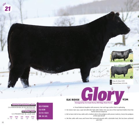 • Proud National daughter with presence, hair and huge outline that is captivating • Her donor dam was a past $21,000 AAC high seller before she was one of the lead bred heifers from the famed Johnson Dispersal • We’ve been told to buy cattle with a bottom side to the pedigree with proven matrons, hence the pedigree of this lady herself • We like cattle with mass and frame that command pounds with a desirable look, this has been achieved with 92M