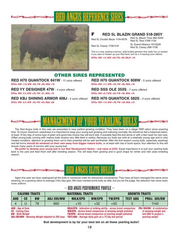 – red angus performance profilE – calving traits maternal traits growth traits aod ce bw adj 205/ww milk/epd ww/epd yw/epd Test ADG Proj. 365/DW 4 u 78 660 +10 +32 +50 3 1140 AOD - Age of Dam CE - Calving Ease BW - Birth Weight ADJ 205/WW - Weaning Weight adjusted to 205 days