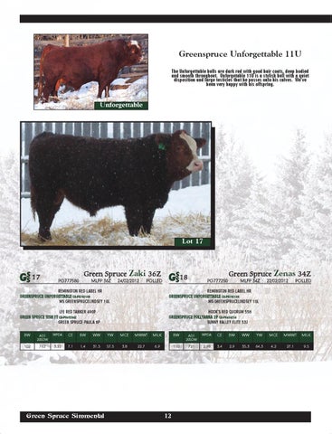 � Greenspruce Unforgettable 11U The Unforgettable bulls are dark red with good hair coats, deep bodied and smooth throughout. Unforgetable 11U is a stylish bull with a quiet disposition and large testicles that he passes onto his calves. We’ve been very happy with his offspring.
