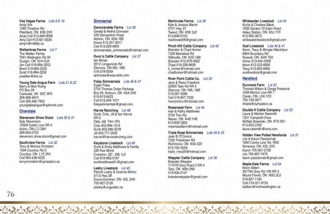 Dunmore Farm Lot 52 Thomas Wilson & Gregg Frederick 1658 Morton Line RR 1 Cavan, ON L0A 1C0 705-749-3971 ohaira@sympatico.ca Double H Cattle Company Lot 53 Laura & Marilyn Naismith 1301 Campbell Drive McNab Braeside, ON K7S 0E1 613-623-3782 laura.naismith@bmo.com Hidden View Polled Herefords Lot 51 Joe & Karen Paszternak 1850 Centre Line Rd RR2 Norwood, ON K0L 2V0 Karen 705-957-3739 Joe 705-957-7470 karen.paszternak@gmail.com Maple-Dale Farms Lot 54 Kevin Aitken 391794 Grey Rd 109 RR 3 Mount Forest, ON N0G 2L0 519-827-1184 Cell 519-321-9724 kaitken@northwellington.ca