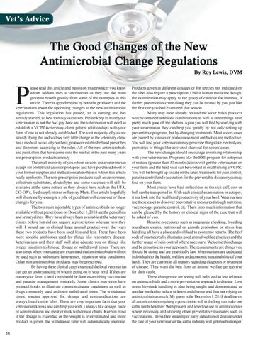 lease read this article and pass it on to a producer you know whom seldom uses a veterinarian as they are the main group to benefit greatly from some of the examples in this article. There is apprehension by both the producers and the veterinarians about the upcoming changes to the new antimicrobial regulations. This legislation has passed, so is coming and has already started, so best to ready ourselves. Please keep in mind your veterinarian is not the bad guy here and the veterinarian will need to establish a VCPR (veterinary client patient relationship) with your farm if one is not already established. The vast majority of you are already doing this and will see very little change as the veterinary clinic has a medical record of your herd, protocols established and prescribes and dispenses according to the rules. All of the new antimicrobials and painkillers that have come onto the market in the past many years are prescription products already. The small minority of you whom seldom use a veterinarian except for obstetrical cases or prolapses and have purchased most of your former supplies and medications elsewhere is whom this article really applies to. The non-prescription products such as dewormers, colostrum substitutes, electrolytes and some vaccines will still be available at the same outlets as they always have such as the UFA, CO-OP’s, feed supply stores or Peavey Marts.This article hopefully will illustrate by example a pile of good that will come out of these changes for you. The two main injectable types of antimicrobials no longer available without prescription on December 1, 2018 are the penicillins and tetracyclines. They have always been available at the veterinary clinics before but did not require a prescription whereas now they will. I would say in clinical large animal practice over the years these two products have been used less and less. There have been more specific antibiotics used for things like respiratory disease. Veterinarians and their staff will also educate you on things like proper injection technique, dosage or withdrawal times. There are also times when your cattle are examined that antimicrobials will not be used such as with many lamenesses, injuries or viral conditions. Other non antimicrobial products may be prescribed. By having these clinical cases examined the local veterinarian can get an understanding of what is going on in your herd. If they are out on your farm, a herd visit should be done establishing vaccination and parasite management protocols. Some clinics may even have protocol books to illustrate common disease conditions as well as drugs commonly used and their withdrawal times. The withdrawal times, species approved for, dosage and contraindications are always listed on the label. These are very important facts that your veterinarian knows and can help you with. I always like dosage, route of administration and meat or milk withdrawal charts. Keep in mind if the dosage is exceeded or the weight is overestimated and more product is given, the withdrawal time will automatically increase.