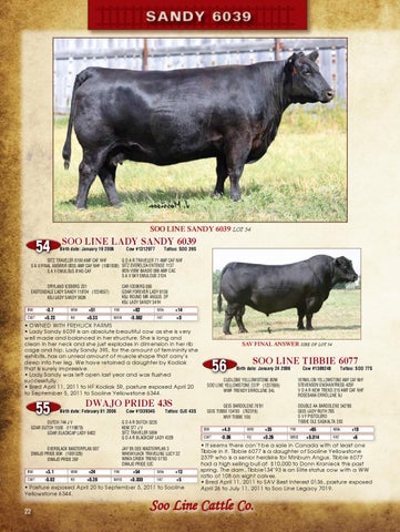 • owned with FREHLICK FARMS • Lady Sandy 6039 is an absolute beautiful cow as she is very well made and balanced in her structure. She is long and clean in her neck and she just explodes in dimension in her rib cage and hip. Lady Sandy 39S, for the amount of femininity she exhibits, has an unreal amount of muscle shape that carry’s deep into her leg. We have retained a daughter by Kodiak that is surely impressive. • Lady Sandy was left open last year and was flushed successfully. • Bred April 11, 2011 to HF Kodiak 5R, pasture exposed April 20 to September 5, 2011 to Sooline Yellowstone 6344.