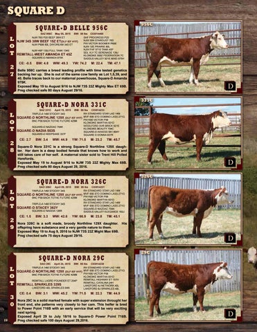 Square-D Nora 331C is a strong Square-D Northline 129X daughter. Her dam is a deep bodied female that knows how to work and still takes care of her self. A maternal sister sold to Trent Hill Polled Herefords. Exposed May 19 to August 9/16 to NJW 73S 22Z Mighty Max 69B. Preg checked safe 80 days August 29, 2016.
