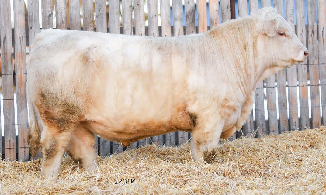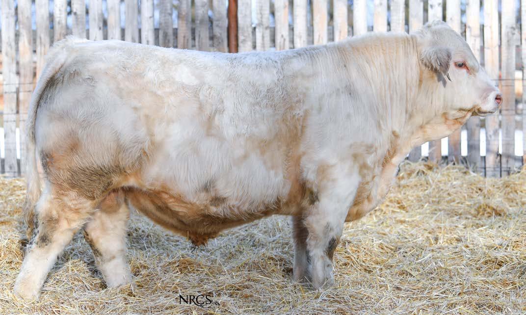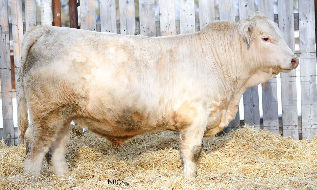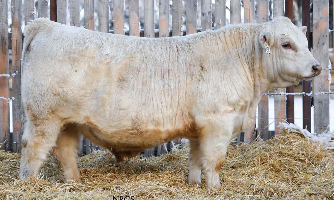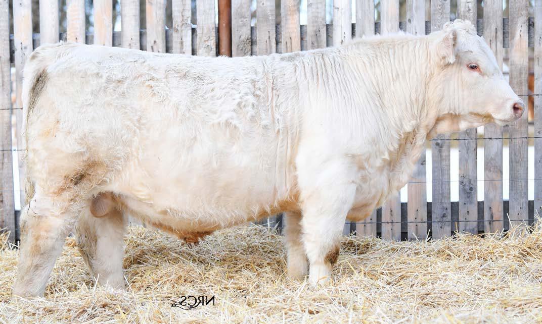 Purchased from Palmer Charolais as a cow bull. Used as a cleanup bull on late calvers for this crop of calves. He was a working machine; his cows were in the main calving pack the next year. His pen of bulls are generally larger framed and coloured. PROGENY