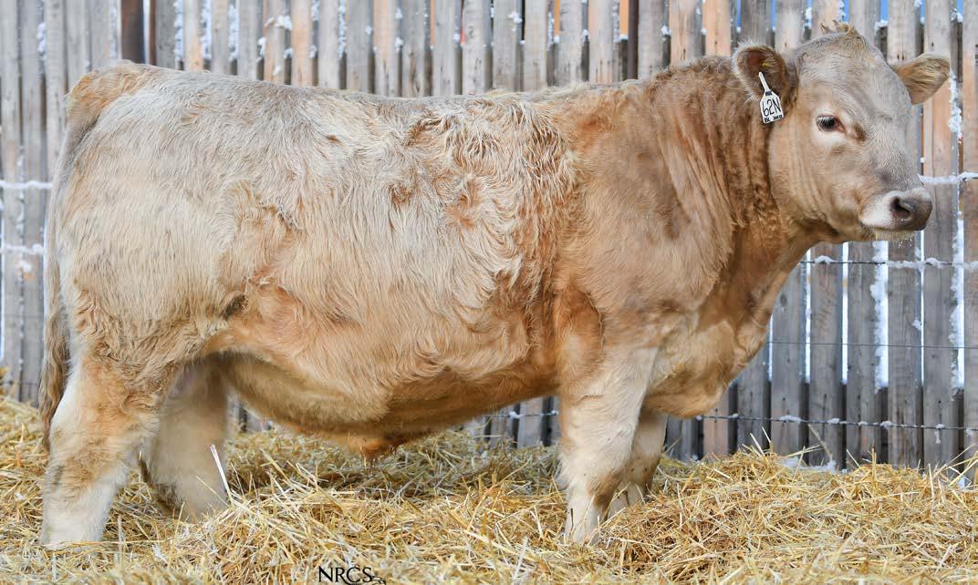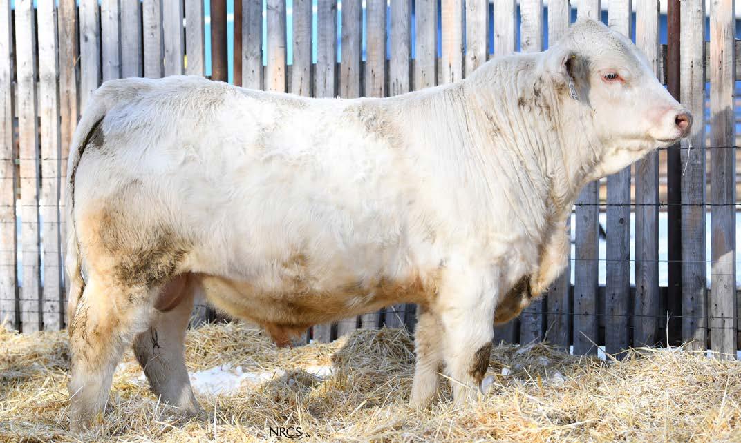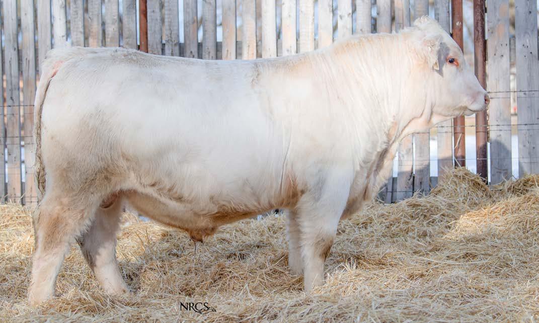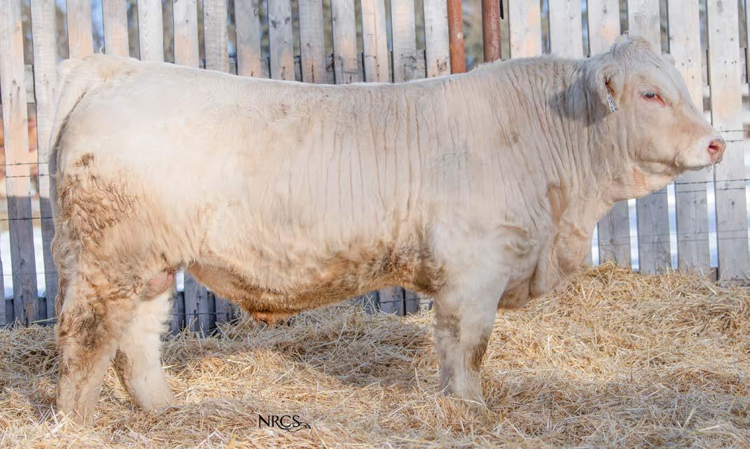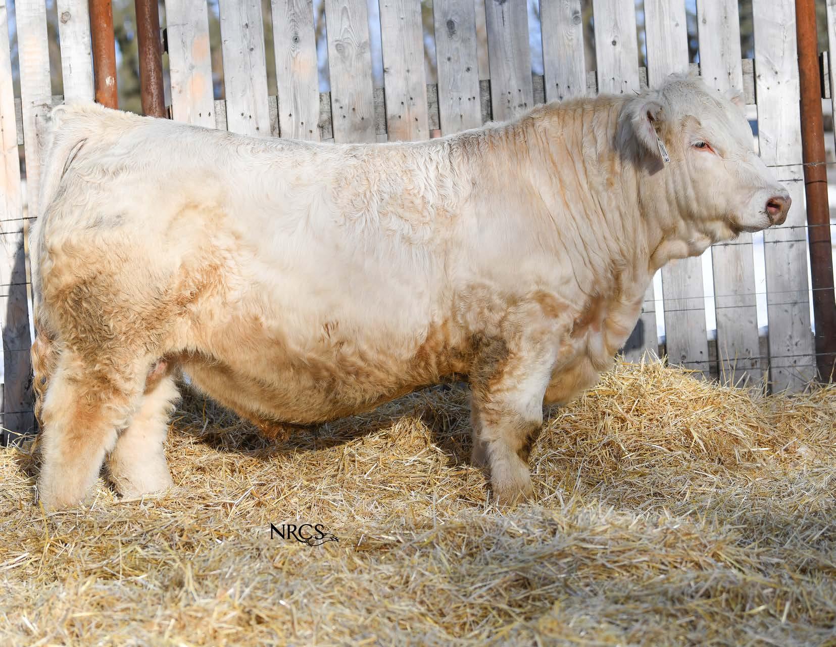 Purchased from Palmer Charolais as a cow bull. Used as a cleanup bull on late calvers for this crop of calves. He was a working machine; his cows were in the main calving pack the next year. His pen of bulls are generally larger framed and coloured. PROGENY