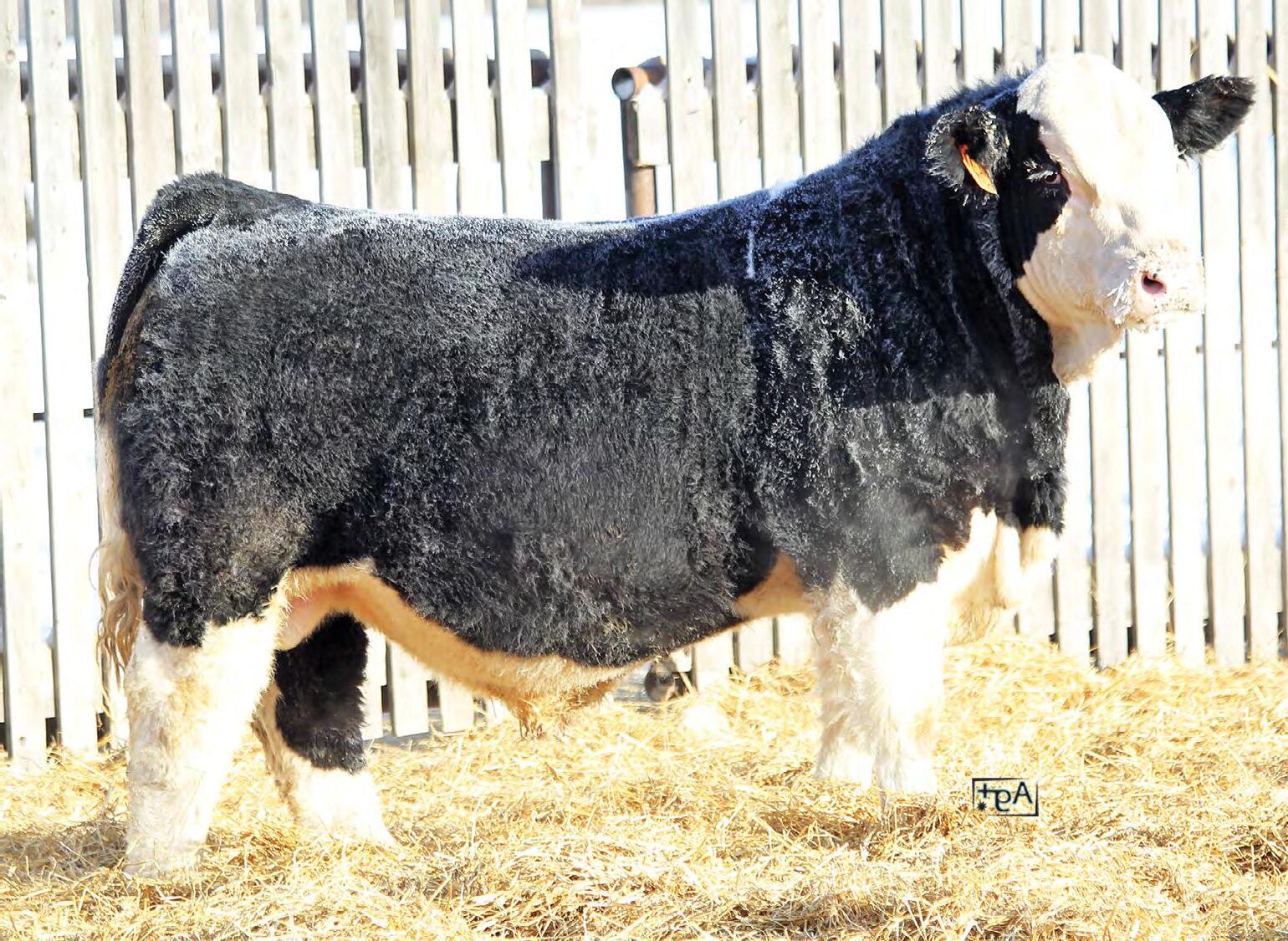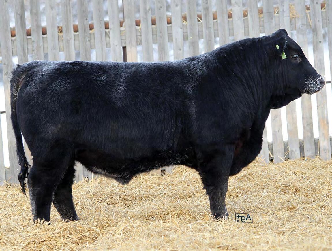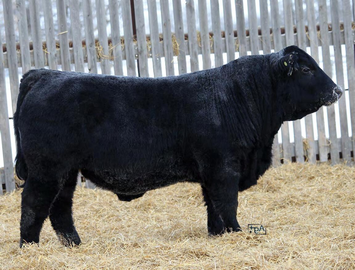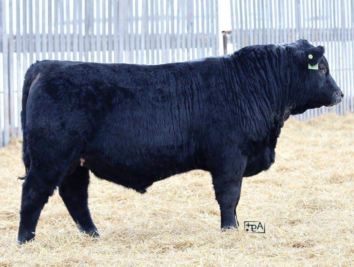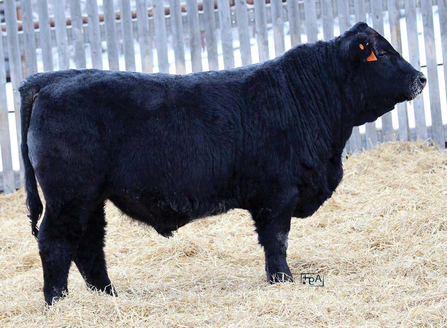 A ¾ Angus bull Ella raised from her 4-H heifer. This bull and his mother had an impressive summer being shown, being named Reserve Champion British pair at Lloydminster 4-H Expo. Then Toby showed the bull calf at the National Junior show in Bashaw where the bull was named Reserve Pee Wee Bull Calf Champion. 4N has matured and is downright impressive in the flesh. He has substantial length of body, explosive muscle through his quarter, a thick hair coat, a big strong foot, and temperament second to none.