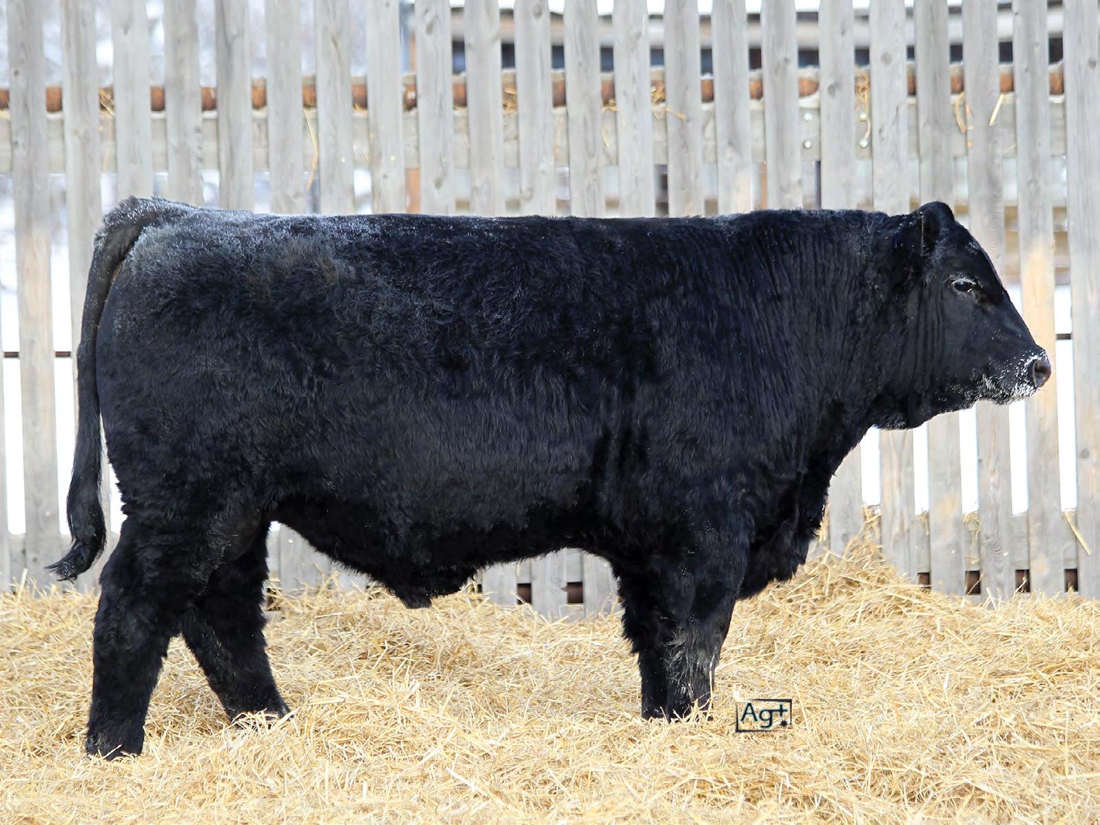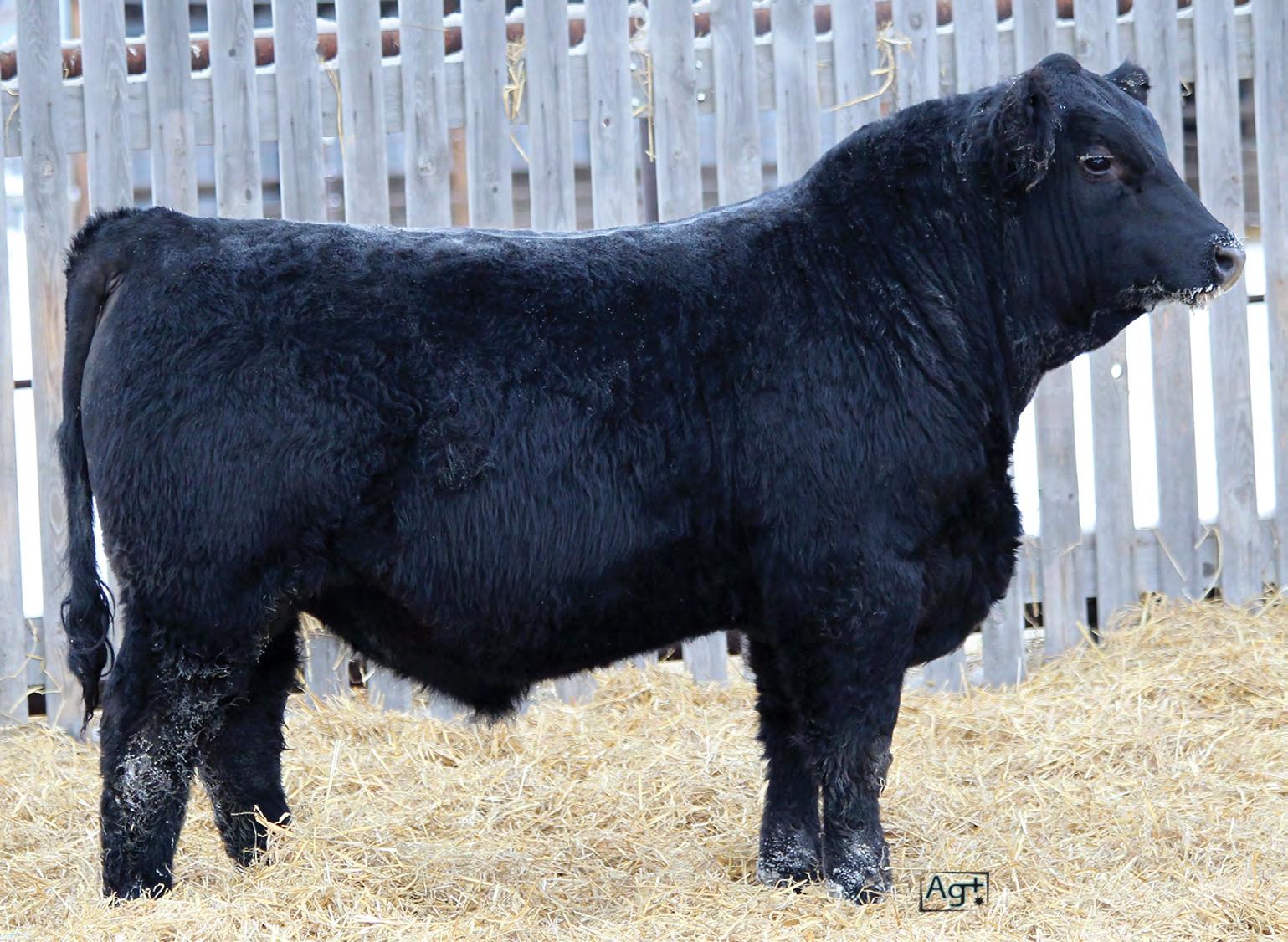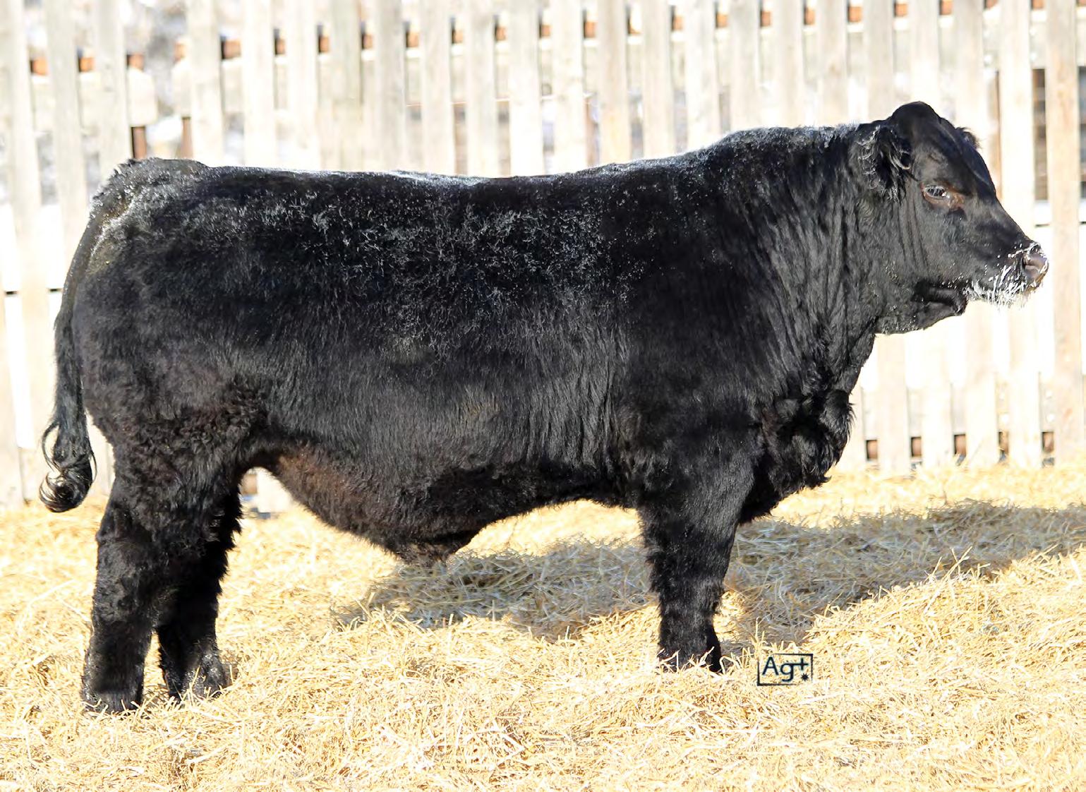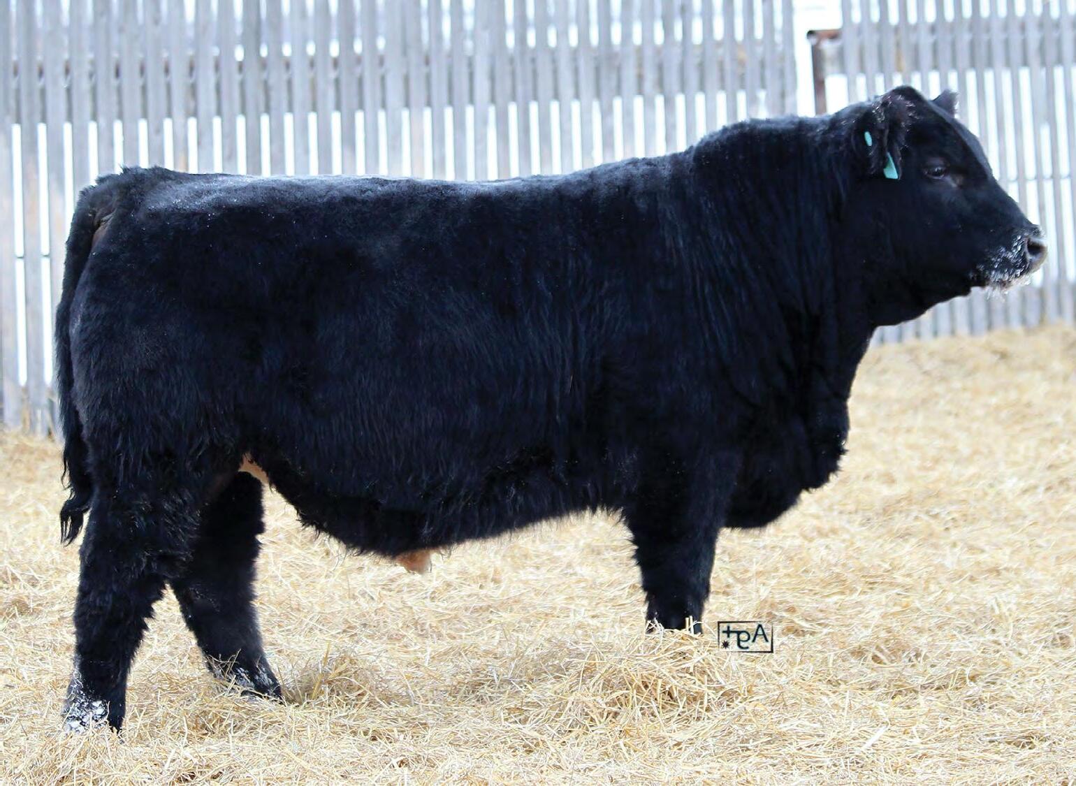 Moderate birth weight, big weaning this solid black bull is long made with lots of hip shape, a big top, and smooth shoulder. His dam is a big cow with lots of volume and a good udder who is a direct daughter of our great donor Smarty Pants.